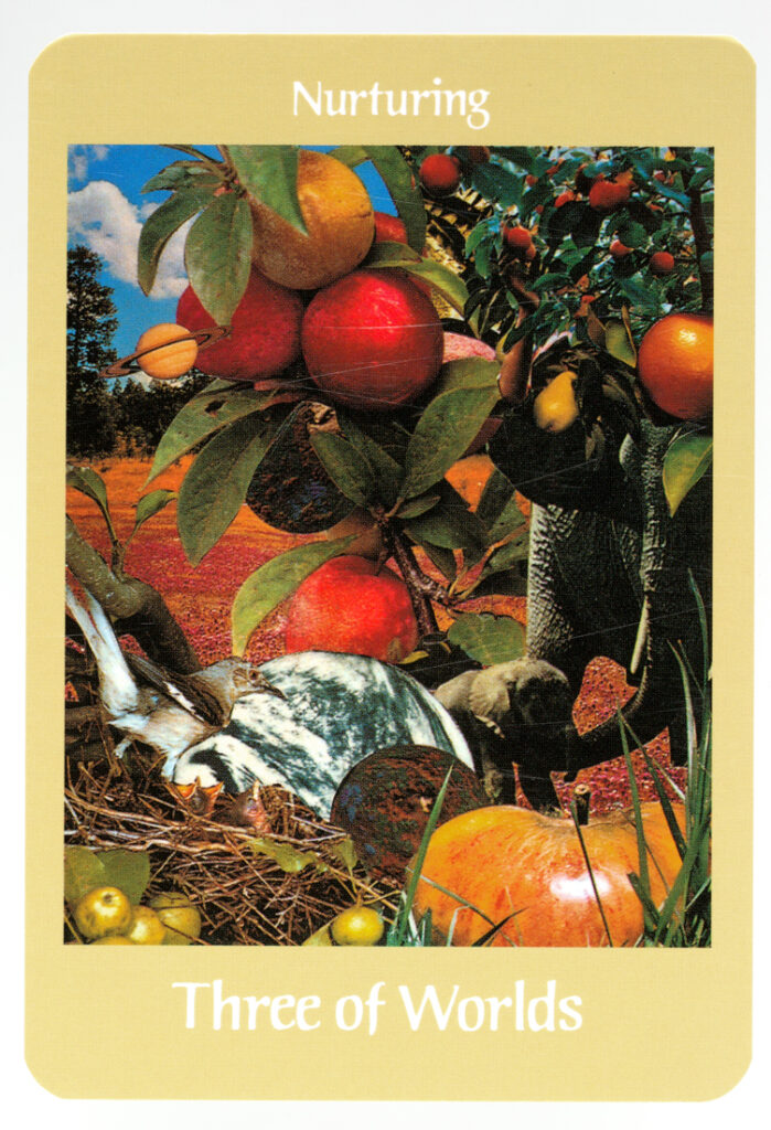 「Nurturing 養育」カードでは、母親の象と母親の鳥が、若い命を完全な結実と花に育てることを象徴しています。夏は春の誕生と始まりの世話を象徴し、Nurturingはビーナスの優しい愛情あるケアと保護的な、木のような母親を求めています。象の胴体のように支援を行い、農夫の手と土星は、成功した育成に必要なビジネスと責任を果たし続ける永続的な患者の姿を象徴しており、収穫は近づいています