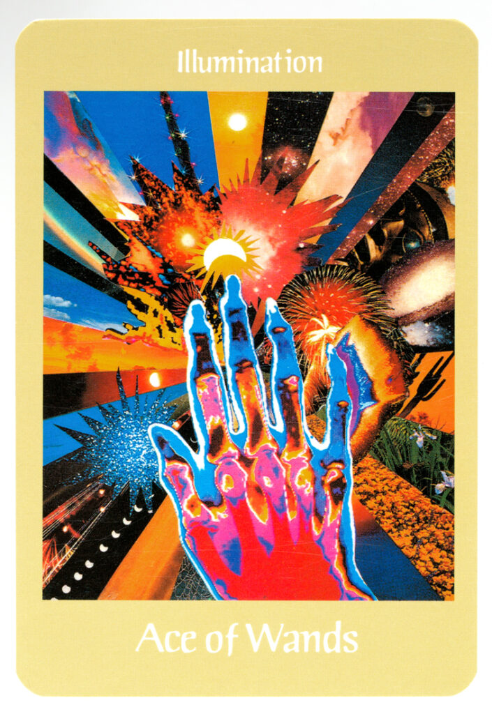 「Illumination(イルミネーション)」カードは、様々なコラージュを用いて「天からのメッセージ」と「それを受け取る手」の瞬間を描いています。このカードは「天」と「地」が触れ合う象徴的な瞬間を捉え、意識の目覚めや叡智と自分が繋がるプロセスを表現しています。インスピレーション(宇宙)と好奇心(自分の手)が触れ合う瞬間を示し、宇宙の法則や仕組みが個人の潜在意識と繋がることを象徴しています