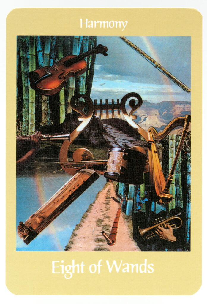 「Harmony(調和)」カードには、さまざまな楽器が調和し、ハーモニーを奏でている様子が描かれています。フルート、トランペット、太鼓など、それぞれの楽器が持つ独自の良さが強調されており、競争ではなく、各々が認め合い、輝き合うことで調和が生まれることが示されています。このカードは、個々が持つ独自の役割と主人公としての存在を強調しています。