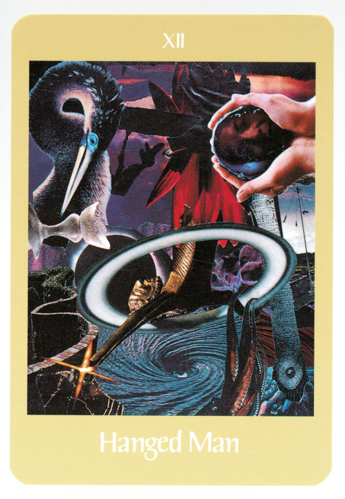 このカードには、逆さ吊りにされたキリストが描かれており、逆転の法則を象徴しています。カードのビジュアルは、勝利と成功が期待どおりの方法ではなく、受動的な降伏によって達成されることを示唆しています。さらに、このカードは、コントロールを超えた窮屈な影響を受けている状態や、自我の放棄を表現しており、これらは「魂の暗い夜」、つまり再生と新しい人生のための準備段階を表しています。このカードはまた、他人の利益のために自己を犠牲にする思いやりを象徴しており、キリストのように自我を超越して宇宙の偉大な精神との組合を成し遂げることを可能にしています