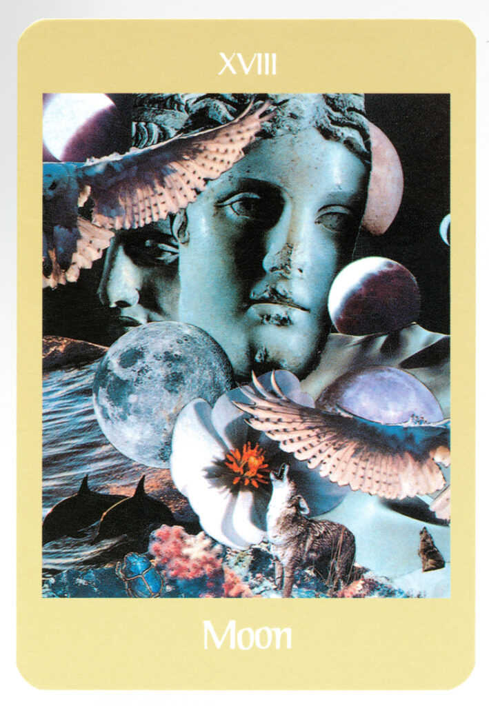「月」カードは、サイクルの法則を象徴しています。このカードは、穏やかで控えめな進化的な変化を経験し、自然の完成が新しい始まりを生み出すことを示唆しています。アフロディーテのようなロマンチックで性的な感情を通じて他人に引き付けられること、ロマンスの幻想に惑わされる可能性、そして理由と論理を表すアポロが背景で覆われていることが描かれています。また、夜は潜在意欲とドライバーの意識を象徴し、二重イルカによって象徴される水と魚座は人々のパターンと周期を知覚することを表しています