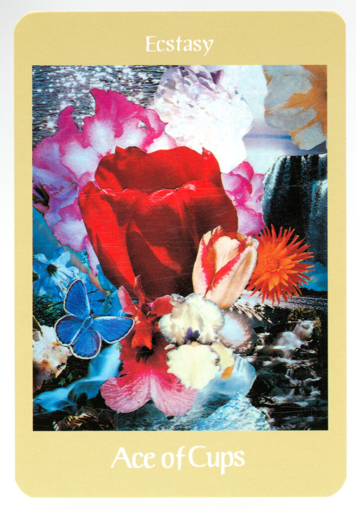 カードのビジュアル要素とシンボル:エクスタシーは、天国の庭園にある神の白い光に感銘を受けたような極端な感情的体験を表しています。色とりどりの虹、甘い香りと絶妙な美しさを持つ花輪は至福、喜び、そして喜びを表現しています。カードのイメージには高い雲の中にあるフラワーカップや流れる滝が描かれており、感情的な豊かさの表出を示しています。また、花が咲く花はこの「ピーク」体験のすさまじい性質を示唆しています